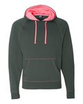 J-America Adult Shadow Fleece Hooded Pullover. 8.5 ounce Dark Grey 60/40% cotton/ polyester fleece fabric. Contrast jersey lined hood. Contrast 3-needle accent stitching. Raglan sleeves. Style ships from Fowlerville, MI.